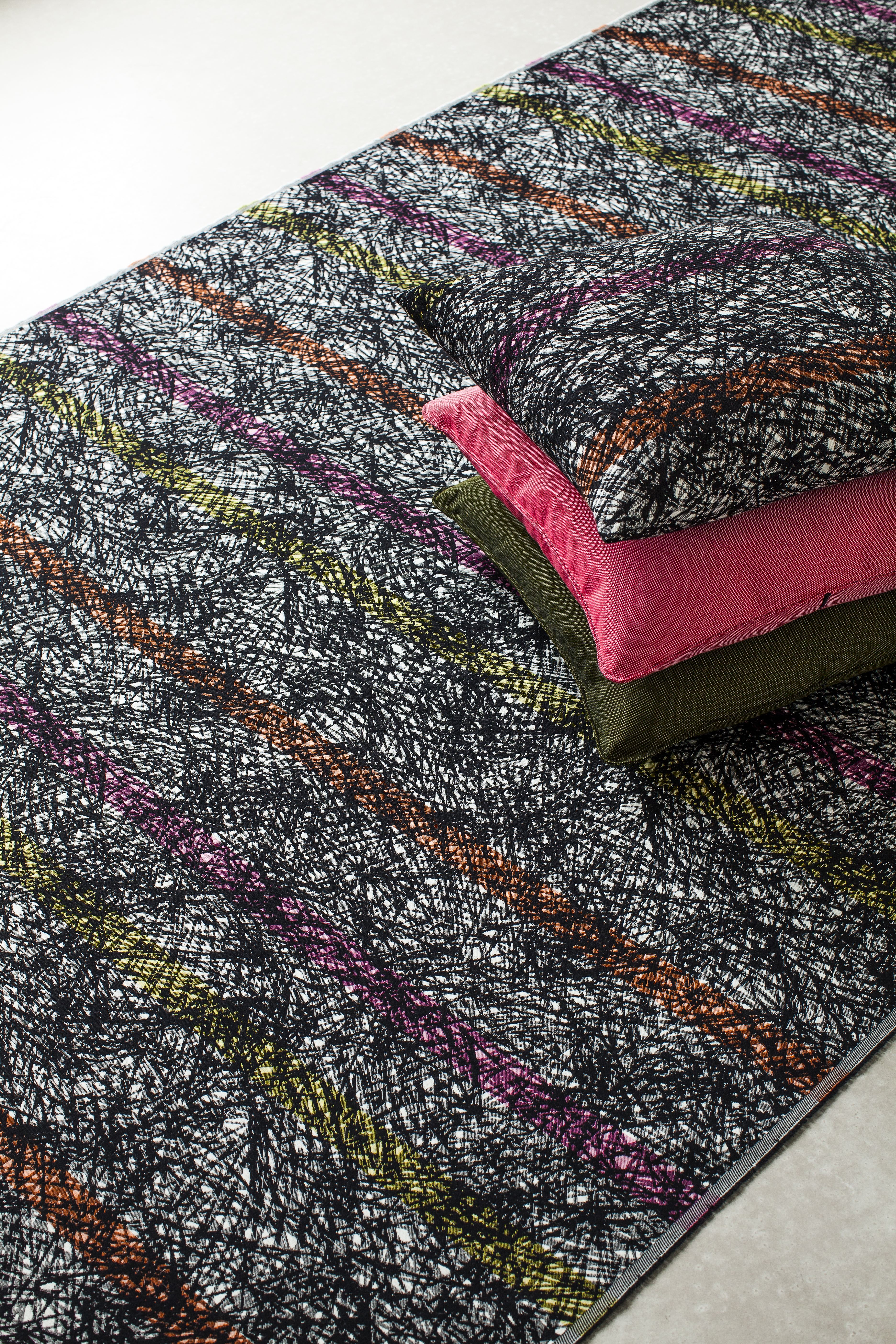 A tangle. Laid on top of a new tangle. And so on. In the background, a soothing stripe that gives the world essential stability. Accessoire is something so unusual as a collection in eco-labelled wool with twelve quite different patterns, which grew out of a collaboration between five designers with their own very strong ideas. In this diversity of soft colours and individual expression there is, however, a cohesive harmony. A harmony in which the patterns not only have the black and white warp in common, but also talk to each other in their aesthetic expression. As the name suggests, the idea is that these fabrics can be used to accessorise your room, emphasising a single piece of furniture or adding joy and life to your entire interior design.