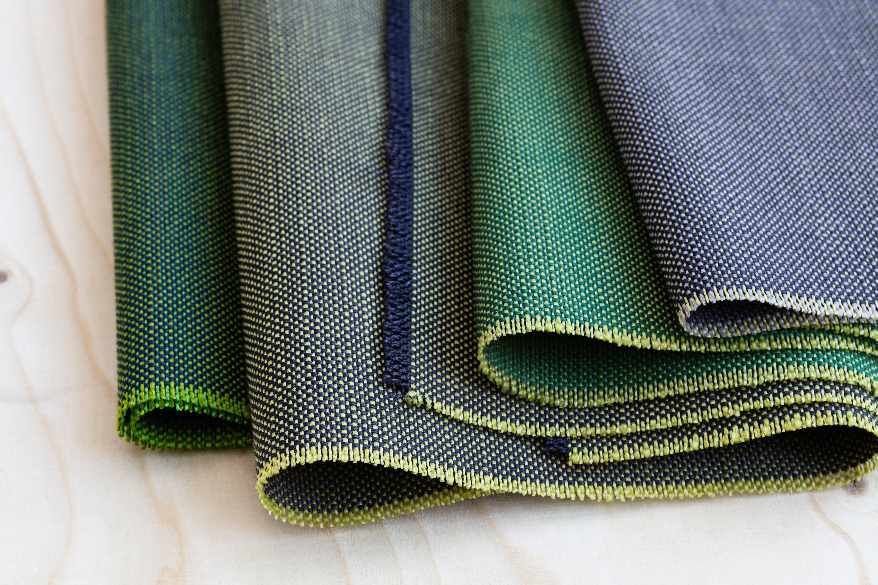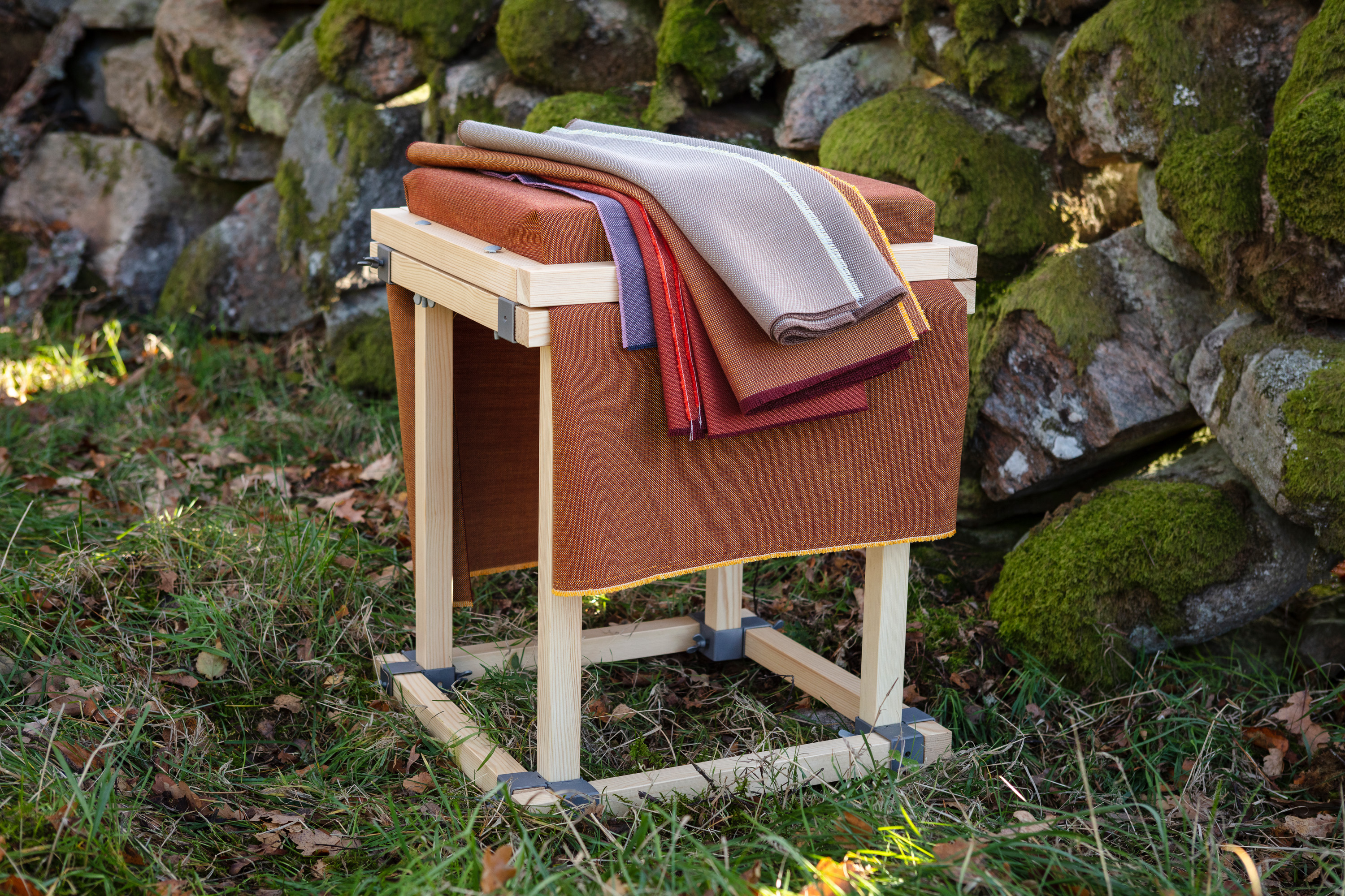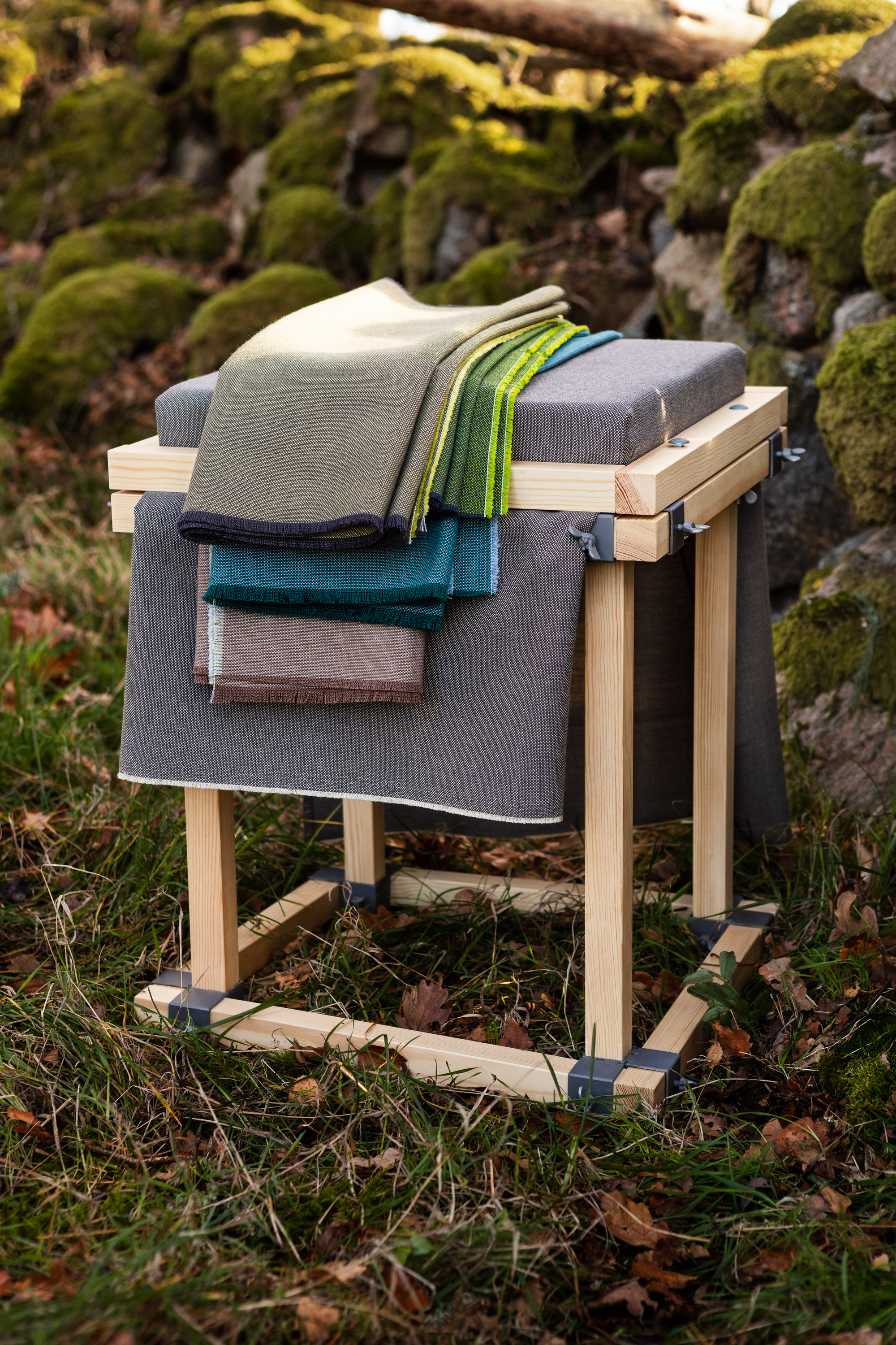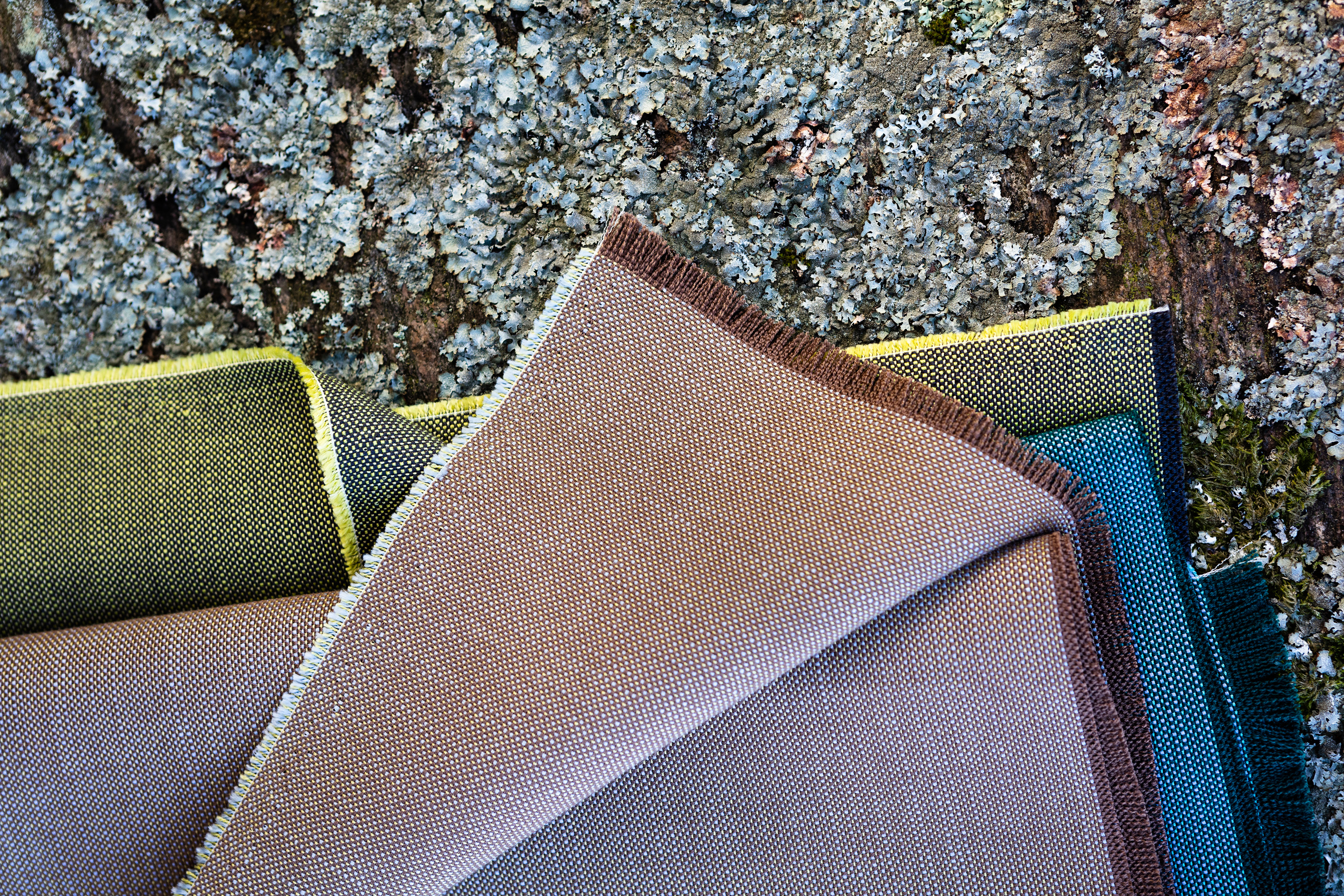 Like a quivering haze on an early summer morning, a tactile sensation of coloured sail cloth bleached by the sun, Khaki's 35 colourways emerge. The yarn's subtle colour mixes give the surface a shimmer and a structure similar to an indestructible linen fabric. From at first being perceived as monochrome, colour after colour emerges out of the depths of the fabric's multifarious background. The different colourways lend themselves very well to combining with each other to give the room's sofa or its large armchair an exciting dynamic.